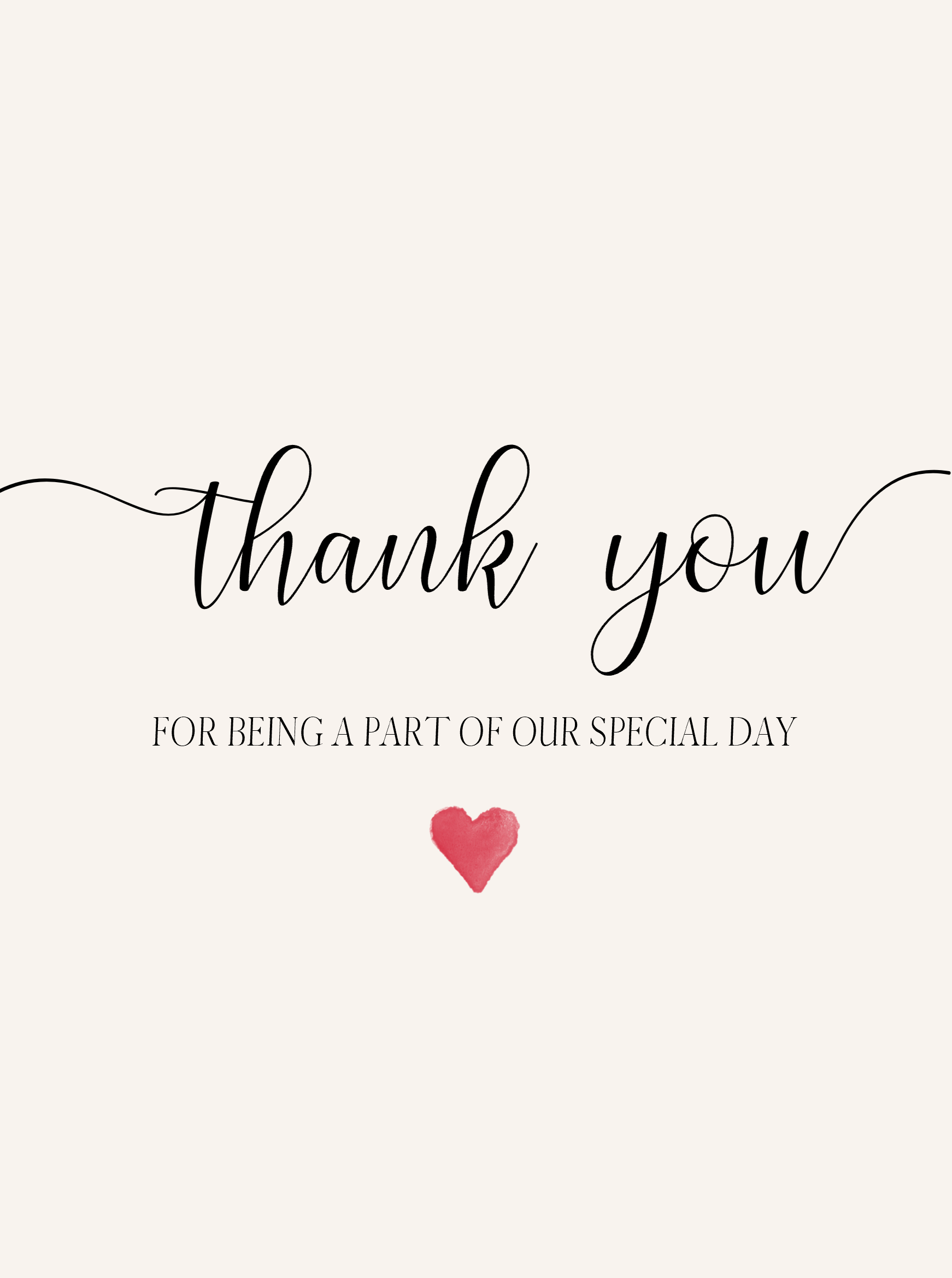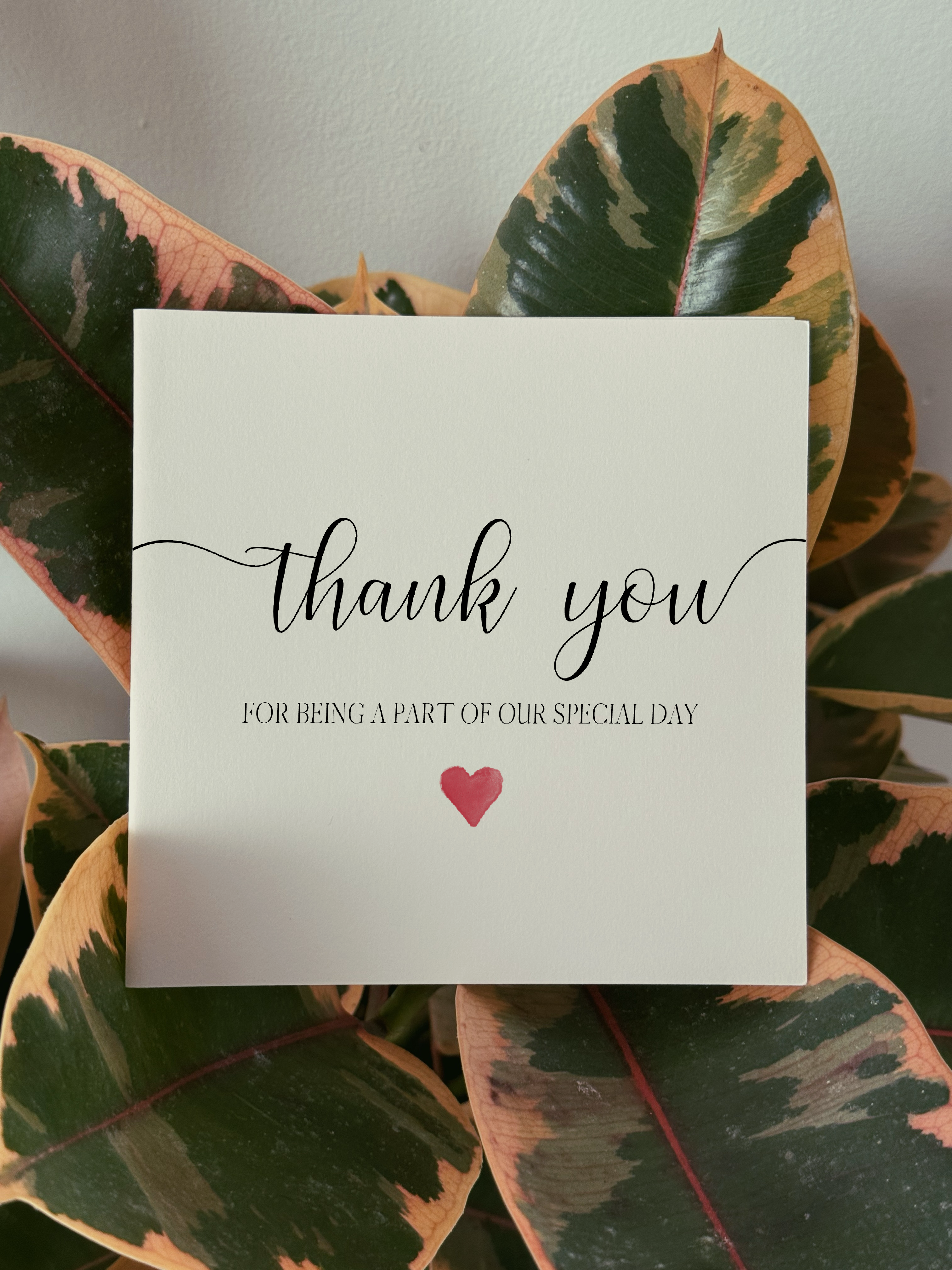 A simple, elegant, square-shaped card featuring Thank You and a small watercolour-style heart. Personalise it with custom text below the main message. Perfect for heartfelt moments big and small!
